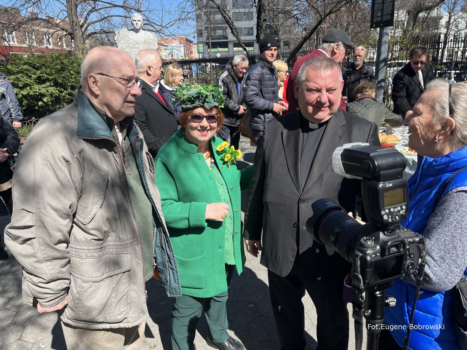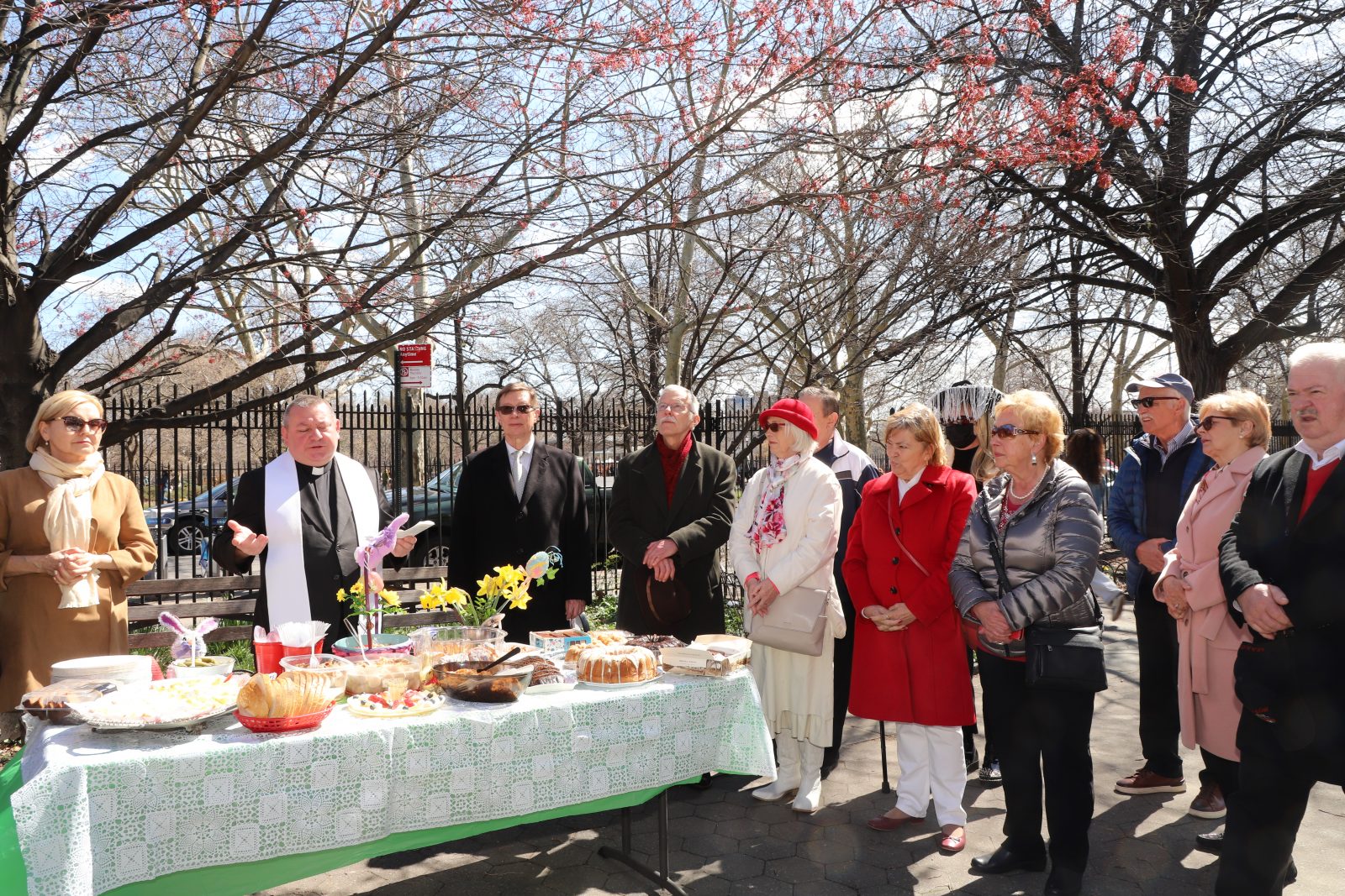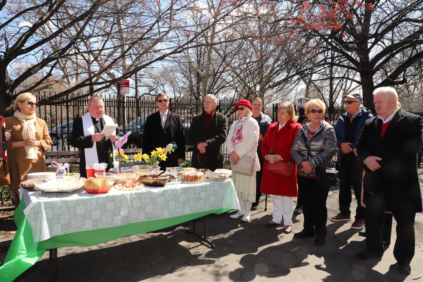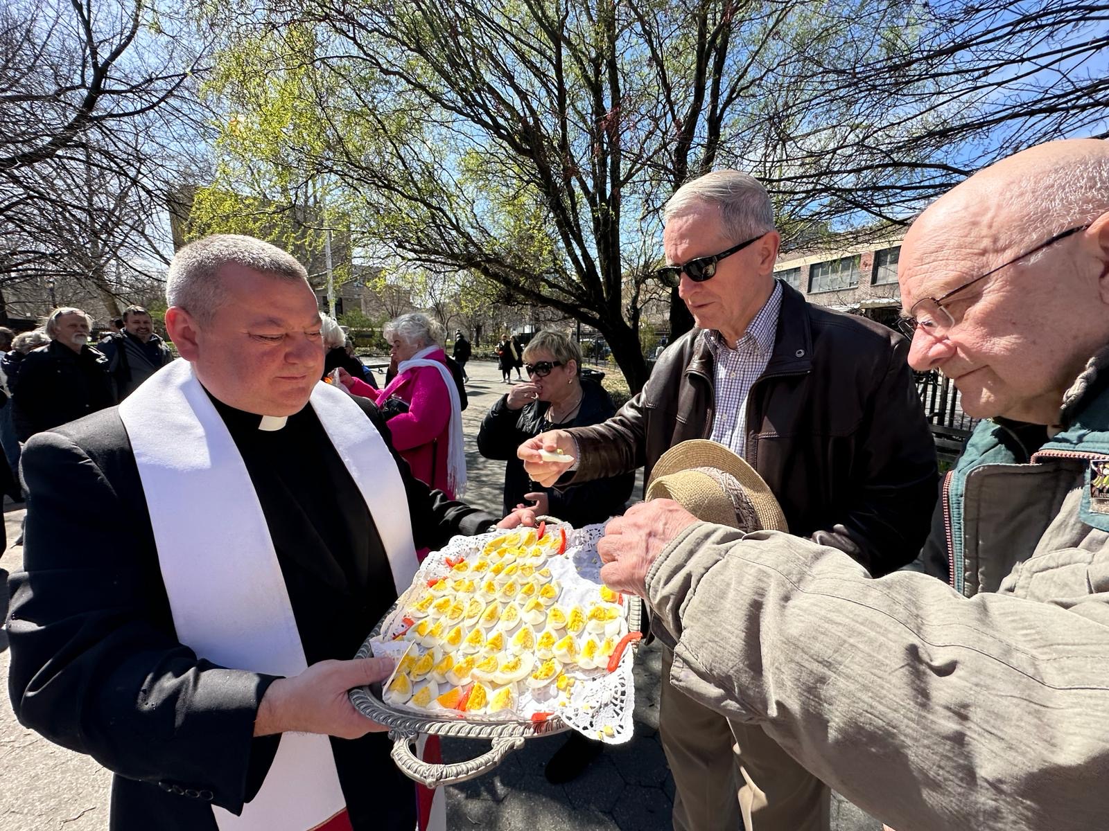 On the initiative of the seniors of the Krakus Club operating in the Polish Slavic Center, on Easter Sunday, March 31, the third meeting took place at the monument of Father Jerzy Popiełuszko in Greenpoint. Members of the Northside Senior Center from Williamsburg, friends and passers-by also attended. We were honored with the presence of: the president of the Polish Slavic Center, Marian Żak with his wife Małgorzata, the new president of the Polish-American Photography Club, Dariusz Kanarek, who came with his father, Krzysztof Kanarek, a former singer from Masovia and soloist of the Warsaw Operetta. Invited priest Grzegorz Markulak, parish priest of St. Stanisław Kostka in Greenpoint said: “After the end of the 40 days of Lent, we gather for the Feast of the Resurrection of the Lord. There is great joy in our hearts because Christ lives and is among us. Together with him, we are here in this community at the Easter table to share love, wish each other, and share the blessed egg, a sign of new life. Let us ask Christ, always present among those who love Him, to bless the food on our Easter table. After reciting the Litany of thanksgiving and prayers, he blessed the Easter food and those gathered.