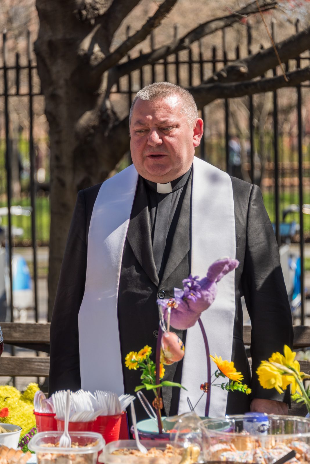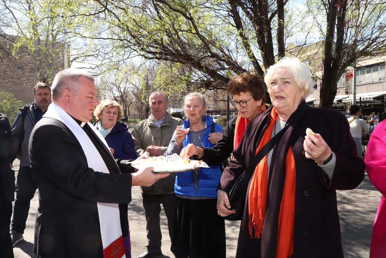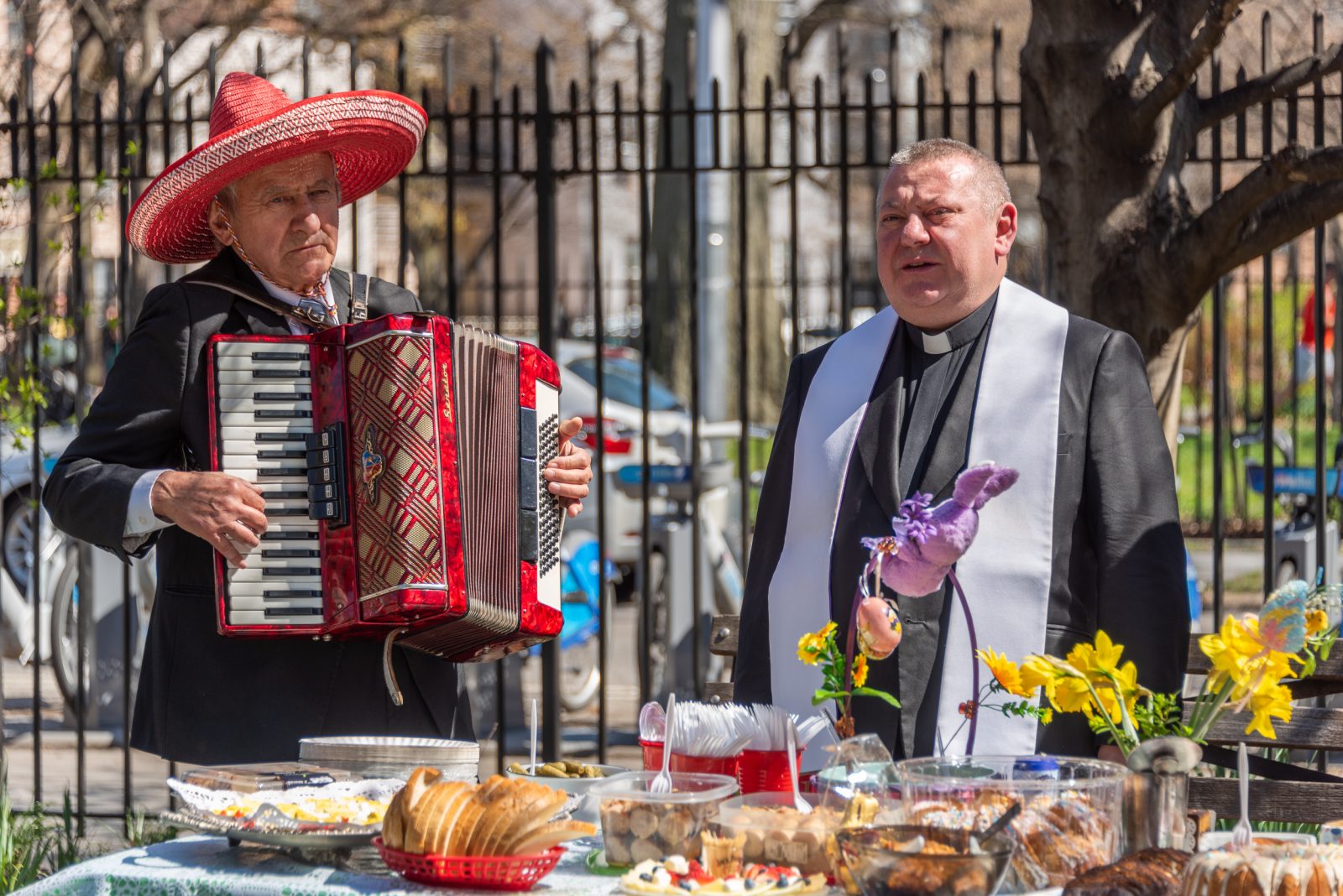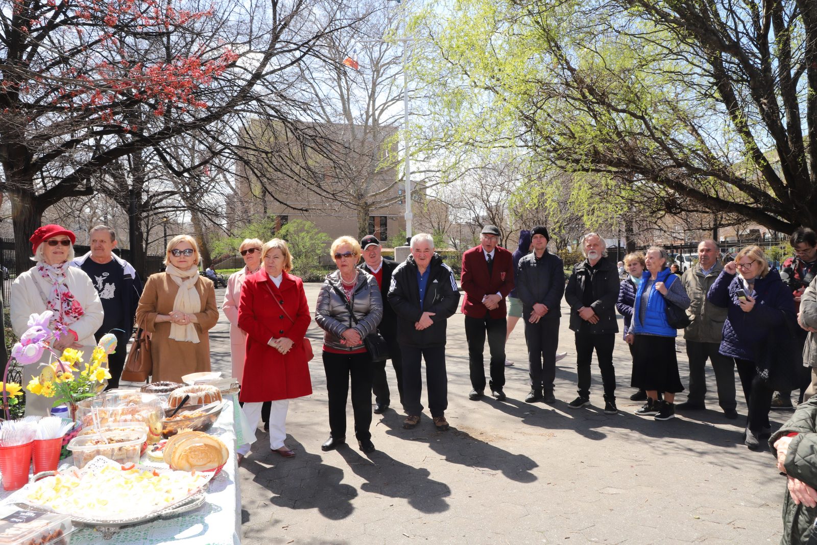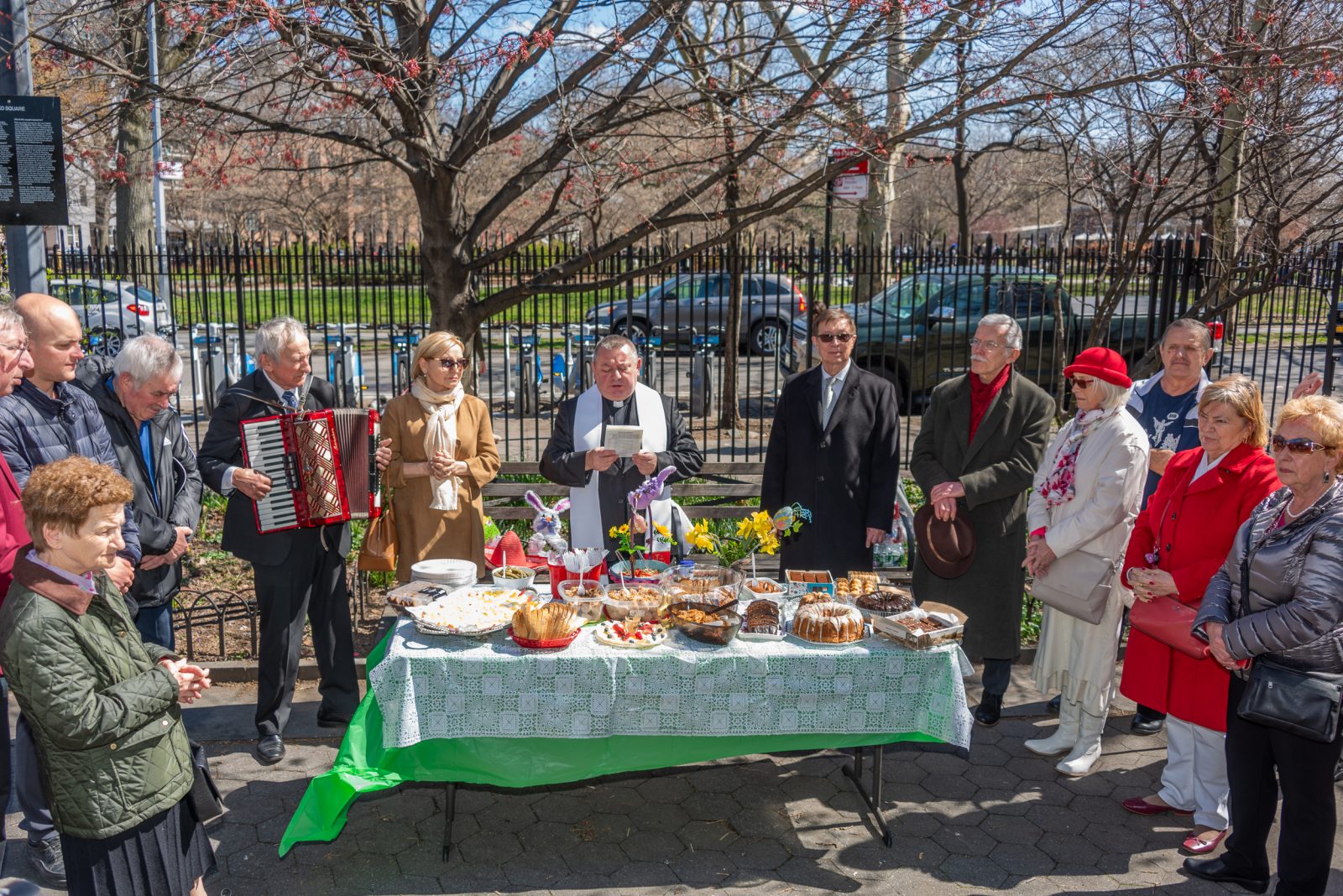 On the initiative of the seniors of the Krakus Club operating in the Polish Slavic Center, on Easter Sunday, March 31, the third meeting took place at the monument of Father Jerzy Popiełuszko in Greenpoint. Members of the Northside Senior Center from Williamsburg, friends and passers-by also attended. We were honored with the presence of: the president of the Polish Slavic Center, Marian Żak with his wife Małgorzata, the new president of the Polish-American Photography Club, Dariusz Kanarek, who came with his father, Krzysztof Kanarek, a former singer from Masovia and soloist of the Warsaw Operetta. Invited priest Grzegorz Markulak, parish priest of St. Stanisław Kostka in Greenpoint said: “After the end of the 40 days of Lent, we gather for the Feast of the Resurrection of the Lord. There is great joy in our hearts because Christ lives and is among us. Together with him, we are here in this community at the Easter table to share love, wish each other, and share the blessed egg, a sign of new life. Let us ask Christ, always present among those who love Him, to bless the food on our Easter table. After reciting the Litany of thanksgiving and prayers, he blessed the Easter food and those gathered.