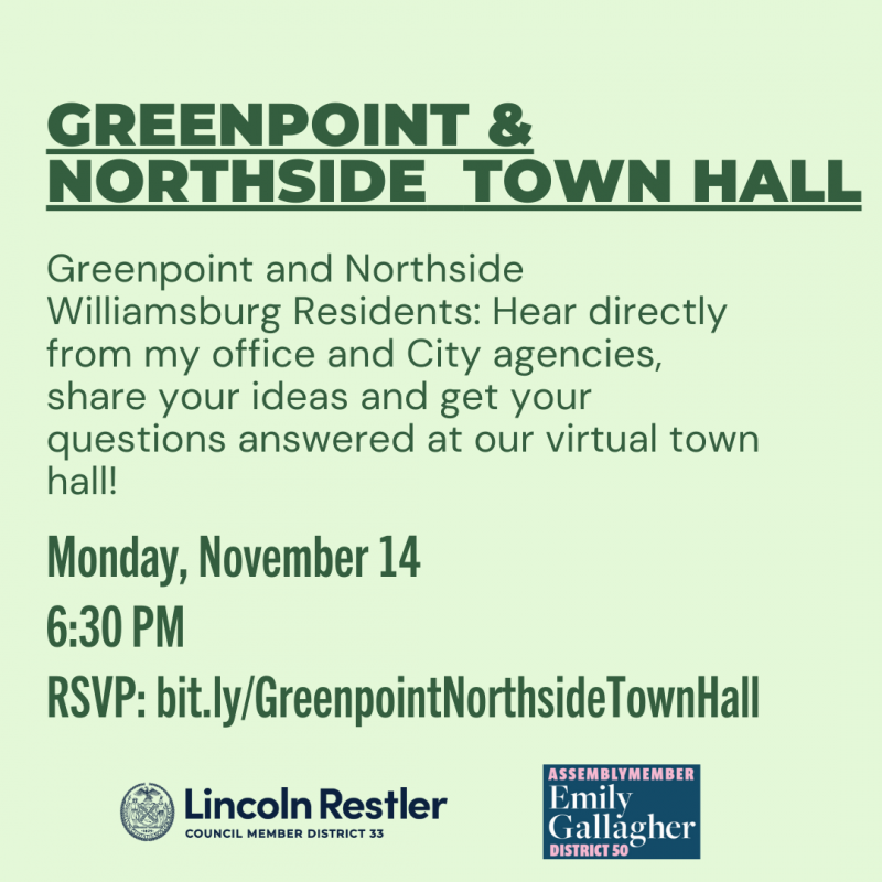 UPCOMING EVENTS Monday, November 14, 2022: Greenpoint and Northsite Town Hall Posted on November 10, 2022November 10, 2022 by AdminAssist Zoom registration link: https://bit.ly/GreenpointNorthsideTownHall Form for submitted questions (we’ll also have live Q+A): https://bit.ly/GreenpointNorthsideQuestions