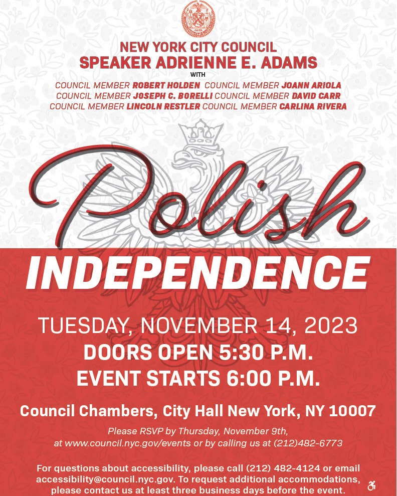 It is with great pleasure that I extend to you, on behalf of the New York City Council, a special invitation to Speaker Adrienne Adams’ and Council Member Robert Holden’s Polish Independence Celebration taking place at New York City Hall on Tuesday, November 14, 2023, at 6:00 PM.