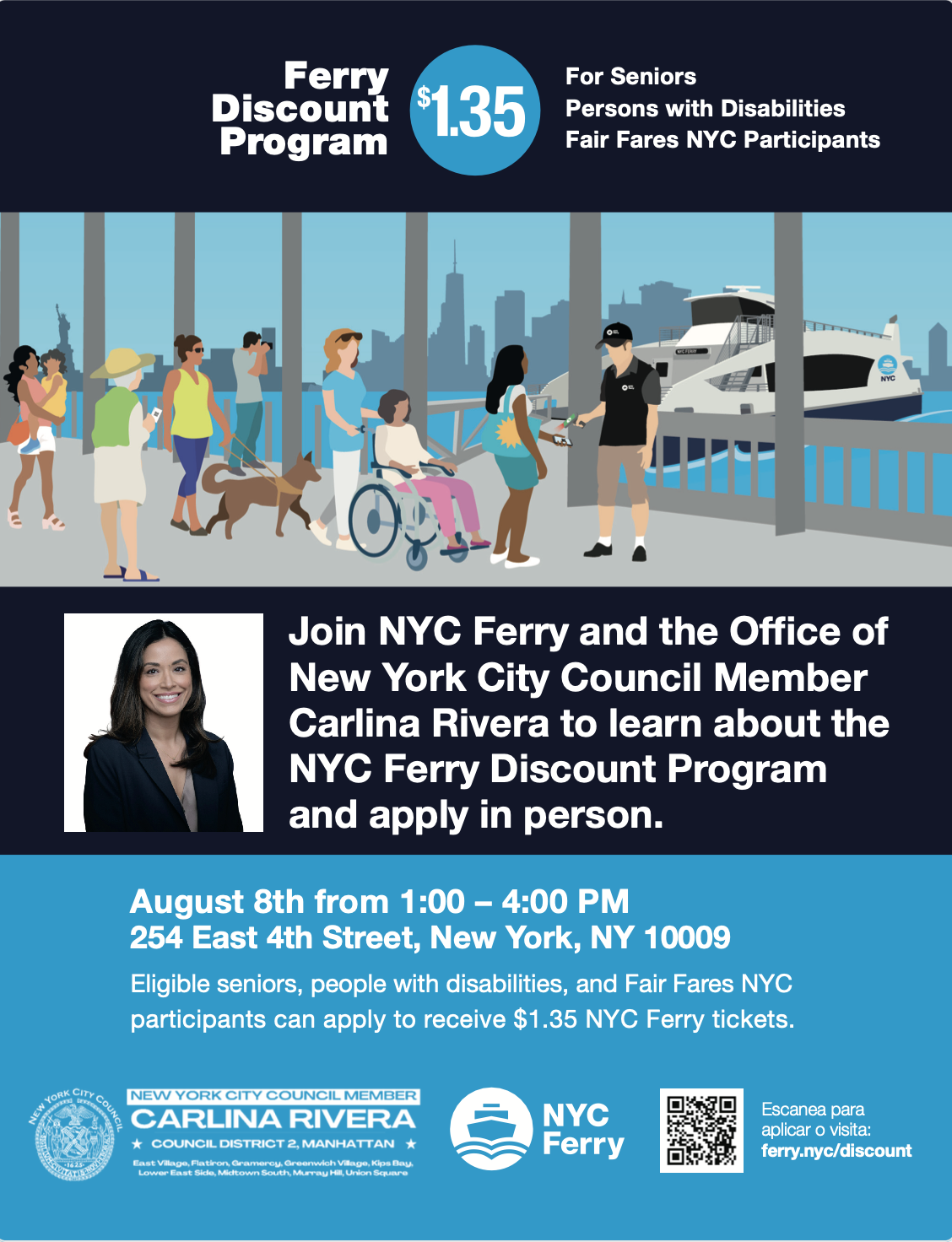 Join August 8, Thursday 1-4pm at the NYC Ferry and the Office of New York City Council Member Carlina Rivera of East Village to learn about the NYC Ferry Discount Program for seniors and apply in person. Everyone Welcome.