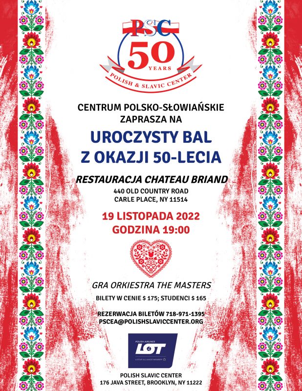 Join us for Polish Slavic Center’s 50th anniversary ball on November 19, 2022 at Chateau Briand (440 Old Country Road) in Carle Place.
