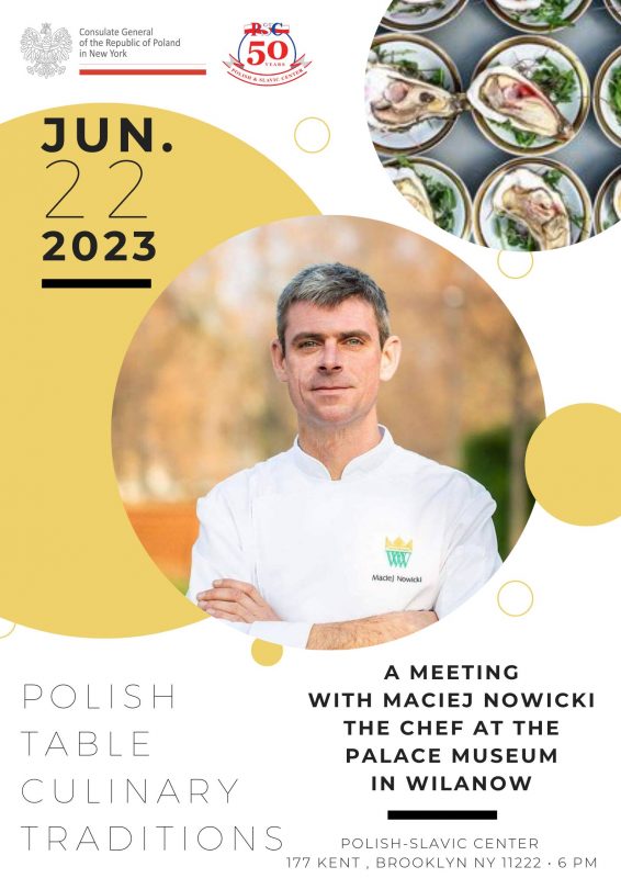 The Polish Consulate General in New York and the Polish-Slavic Center invite you to a talk about the secrets of Polish culinary traditions, that will be held on June 22, 2023 at 6 PM at the Polish-Slavic Center at 177 Kent Street, Brooklyn NY 11222.