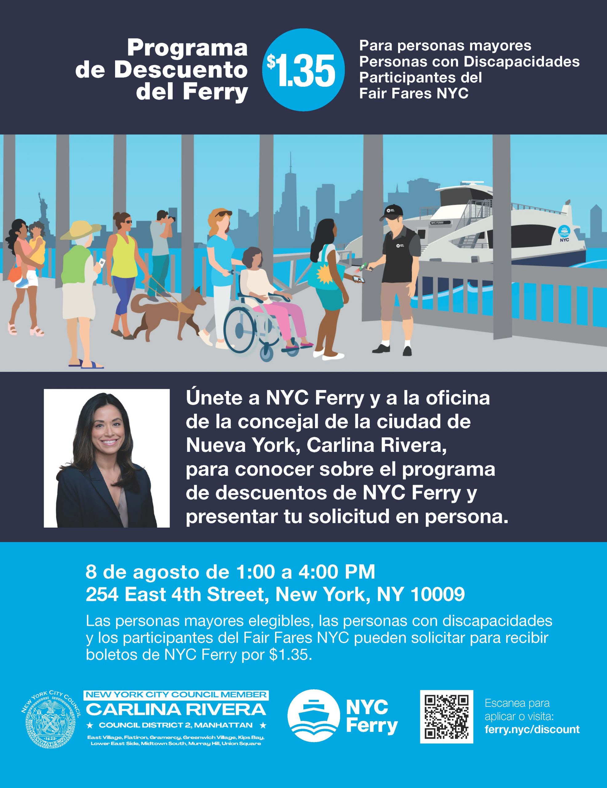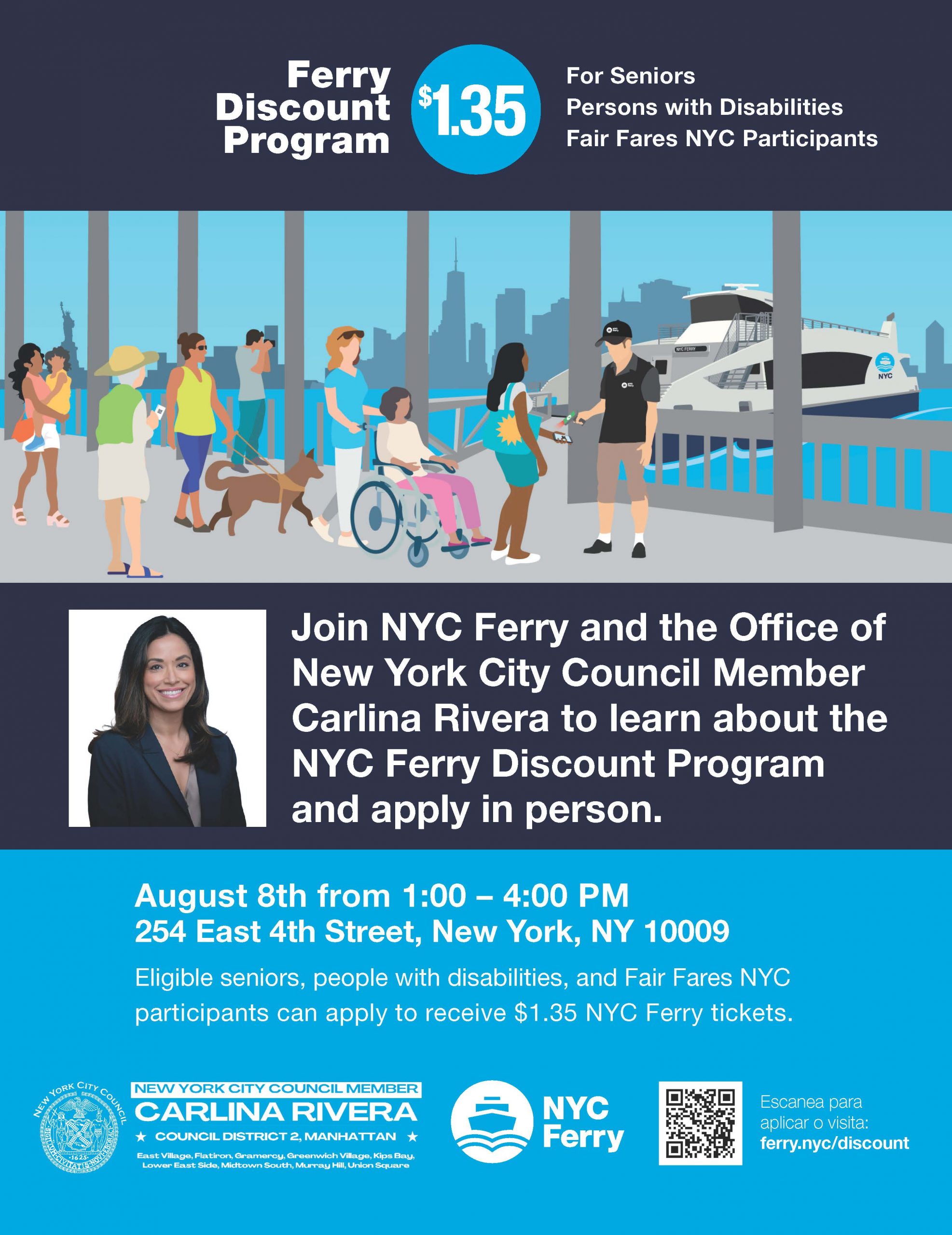 We invite you to Council Member Rivera’s upcoming “NYC Ferry” day, which will be held on Thursday, August 8 from 1:00pm to 4:00pm at 254 E 4th Street. The NYC Ferry will be in our district office to enroll eligible constituents to the NYC Ferry Discount Program. Please see the flyer for more information.